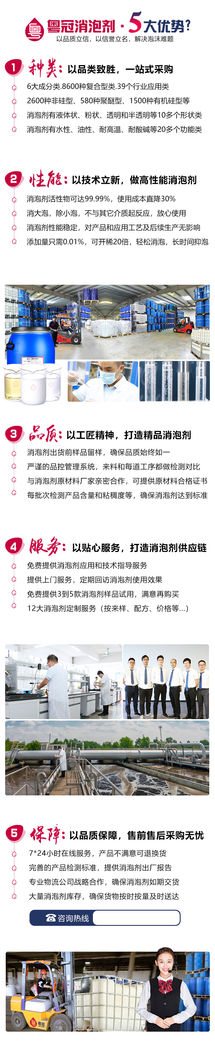 粵冠消泡劑產(chǎn)品廣泛應用于水處理、切削液、工業(yè)清洗、印染、造紙、涂料、粘合劑,生物發(fā)酵、電廠脫硫、石油開采等38個行業(yè)領域,有消泡解決方案3000多種類型。產(chǎn)品有有機硅類,聚醚類,礦物油類,高碳醇類,脂肪酸類,有單體,有復合體,有透明的,有淡黃的,有乳白的各種類型消泡劑,實現(xiàn)一站式采購。